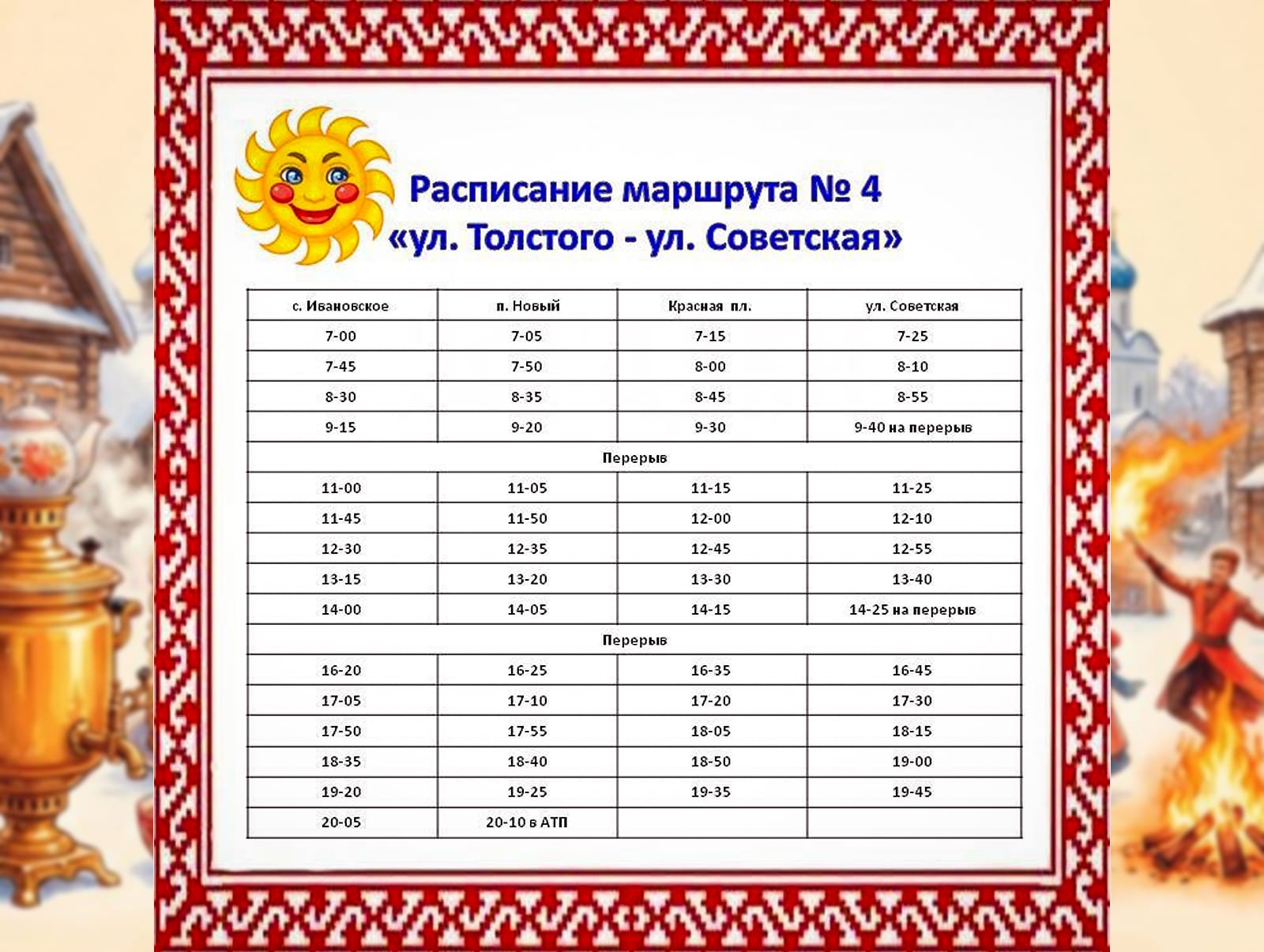 - №4 «ул. Толстого – ул. Советская»: по измененному расписанию (детали — на сайте администрации или в АТП).