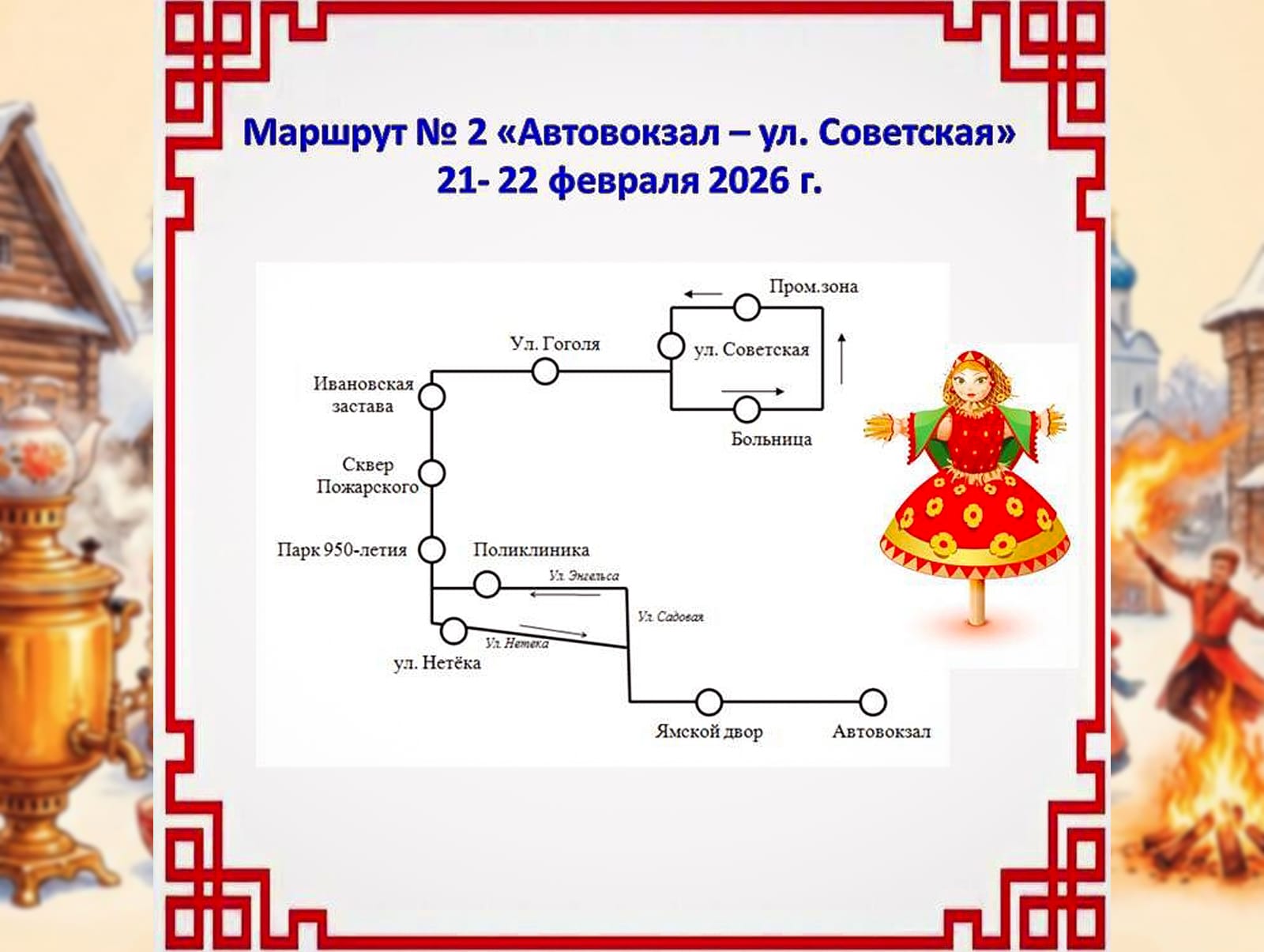 В период гуляний 21–22 февраля корректируется расписание городских маршрутов из-за перекрытий: